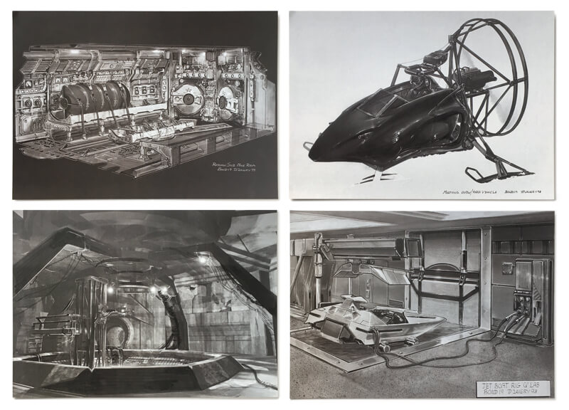 Four production set sketches that were given away when collecting tokens from purchases of the James Bond Special Edition DVDs. Included are the Goldfinger laser room, Dr No's underground apartment living room, Moonraker shuttle launch complex and Diamonds Are Forever Las Vegas Penthouse (MGM Home Entertainment, UK, 2000-03)