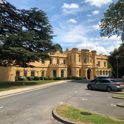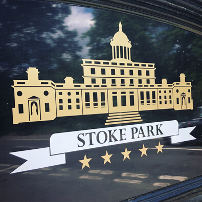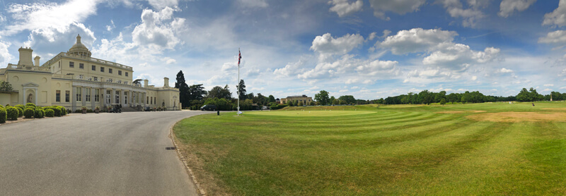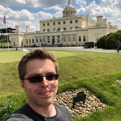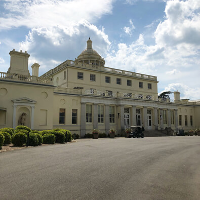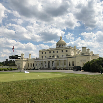 Stoke Park, Stoke Poges, Buckinghamshire which is the club where we see Bond, Goldfinger, Oddjob, and not forgetting Hawker, playing golf in Goldfinger. The interior was also used for one scene in Tomorrow Never Dies. (Visited May 2019)