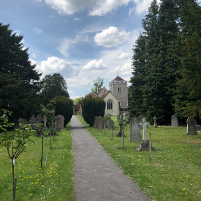 St Giles Churchyard, Stoke Poges, Buckinghamshire which is the church used in the pre title sequence of For Your Eyes Only when Bond is visiting the grave of Tracey. (Visited May 2019)