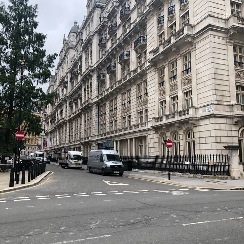 The rear entrance to the Liberal Club on Whitehall Place, London (opposite Embankment Station), as seen in Skyfall when Silva emerges from the London Underground and climbs into the police vehicle. (Visited October 2022)
