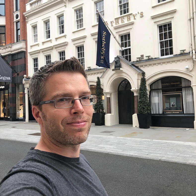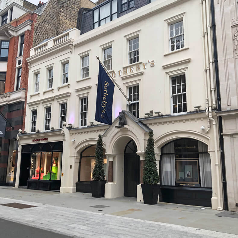 Sotheby's auction House on New Bond Street in London as seen in Octopussy as Bond tails Madga as she leaves the auction. The news kiosk seen in the film has long since gone. (Visited August 2021)