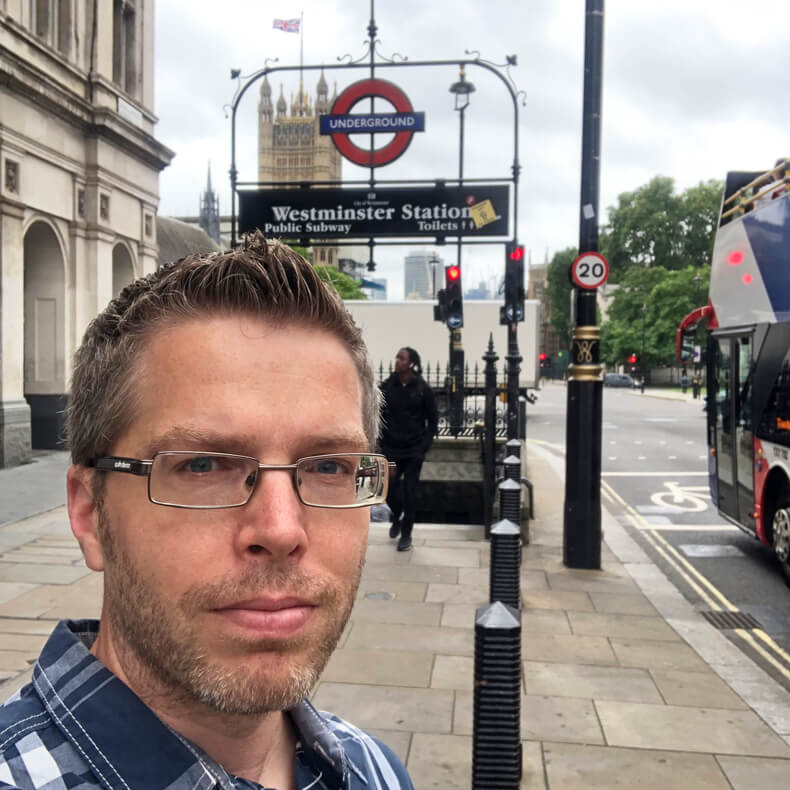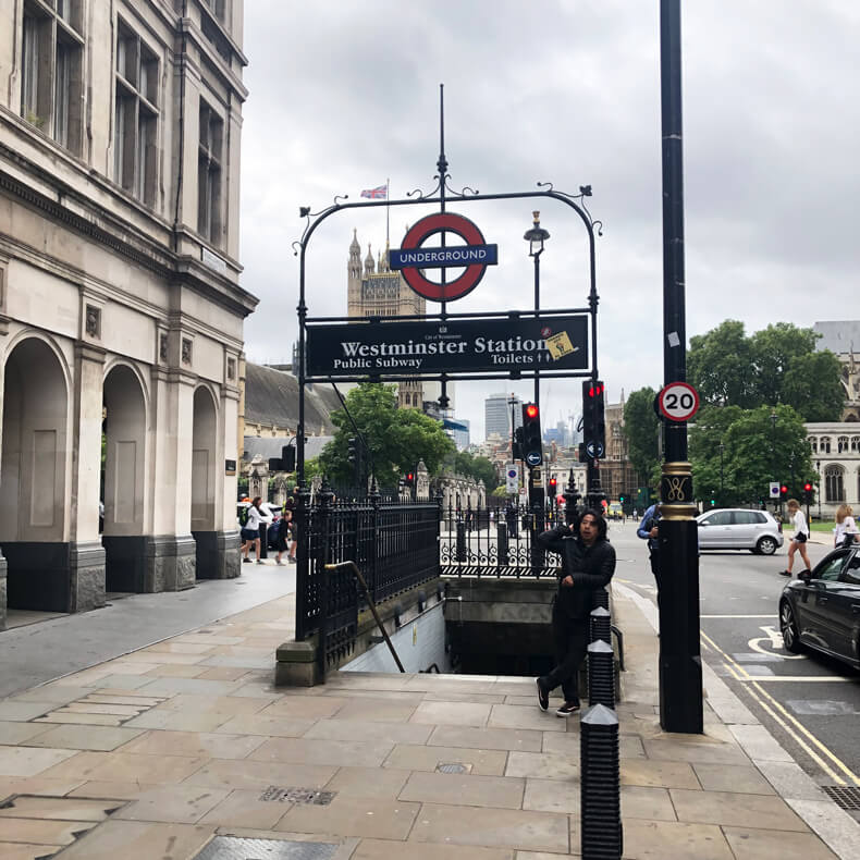 Westminster Station tube station exit onto Parliament Street in London as seen in Skyfall as Bond exits and runs up the middle of the street towards M at her hearing as see reads the Tennyson poem. (Visited August 2021)