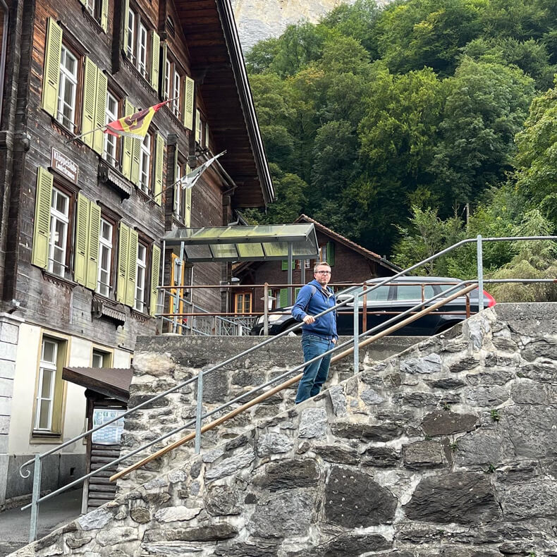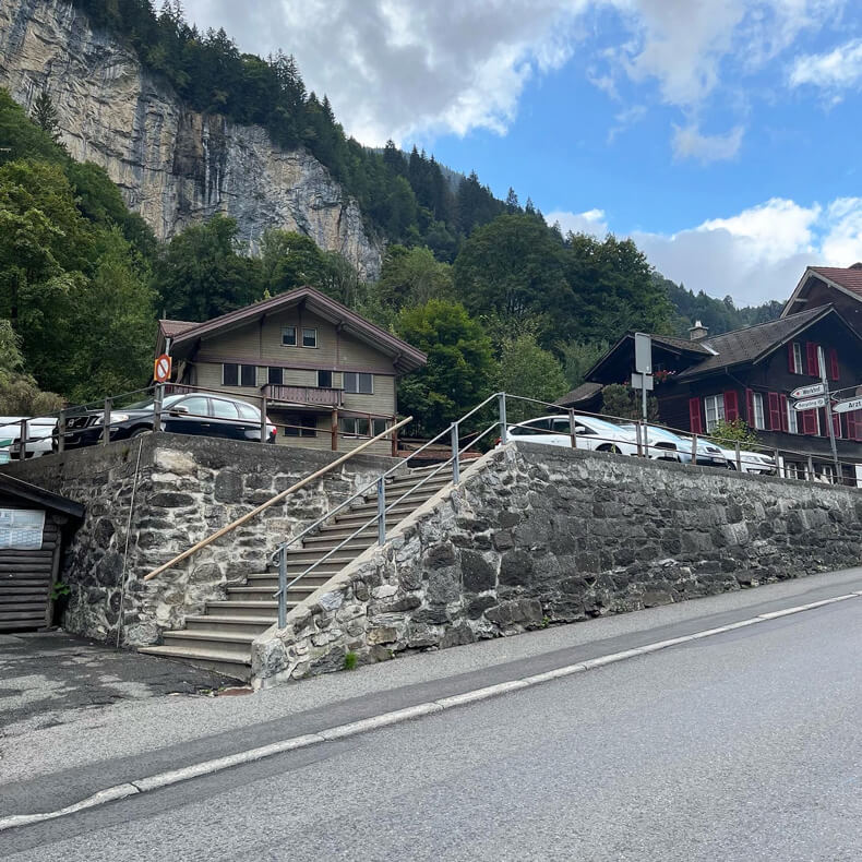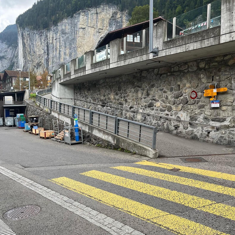 The ramp out of the train station Lauterbrunnen, Switzerland. This is the location where Bond and Bunt leave in a horse-drawn sleigh followed by Campbell in his white VW Beetle in On Her Majesty's Secret Service. (Visited September 2022)