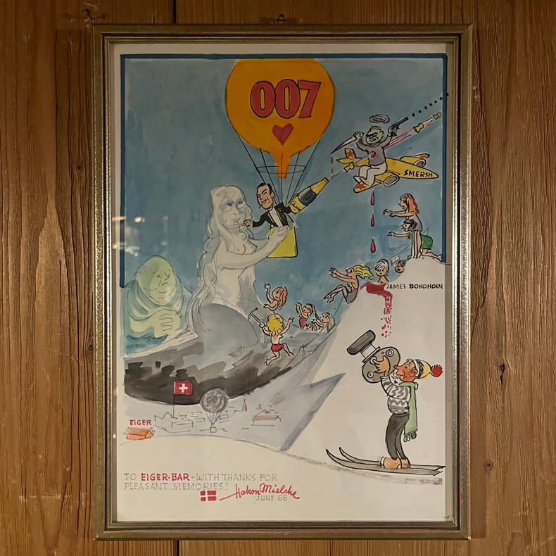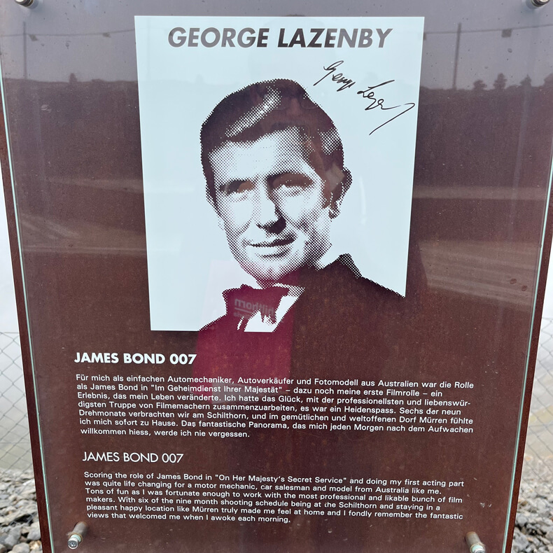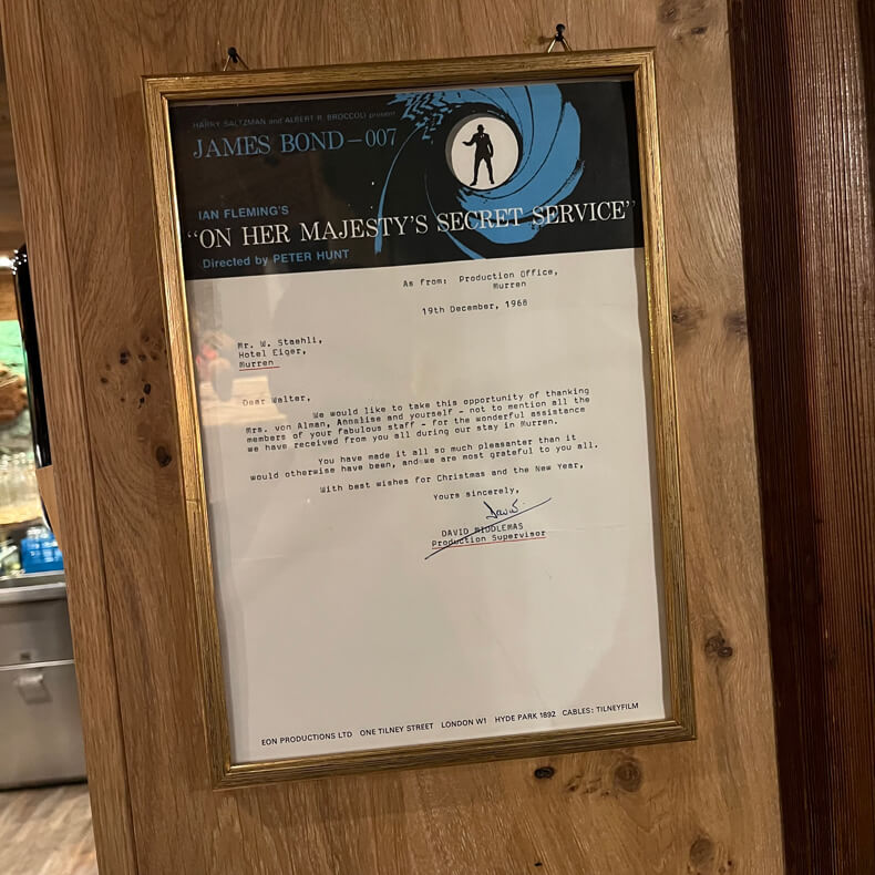 Not a location as such, but the Hotel Eiger in Mürren is one of the hotels used by cast and crew during production of On Her Majesty's Secret Service. The Tächi Bar in the hotel features some mementos from this period, including a letter from the films Production Supervisor David Middlemas (Visited September 2022)
