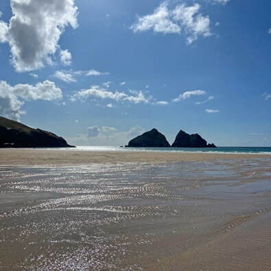 Holywell Bay beach near Newquay in Cornwall. This beach was one of many locations that doubled for North Korea in the pre-title sequence of Die Another Day. The two large rocks off the coast were digitally flipped in the film for some strange reason! (Visited July 2023)