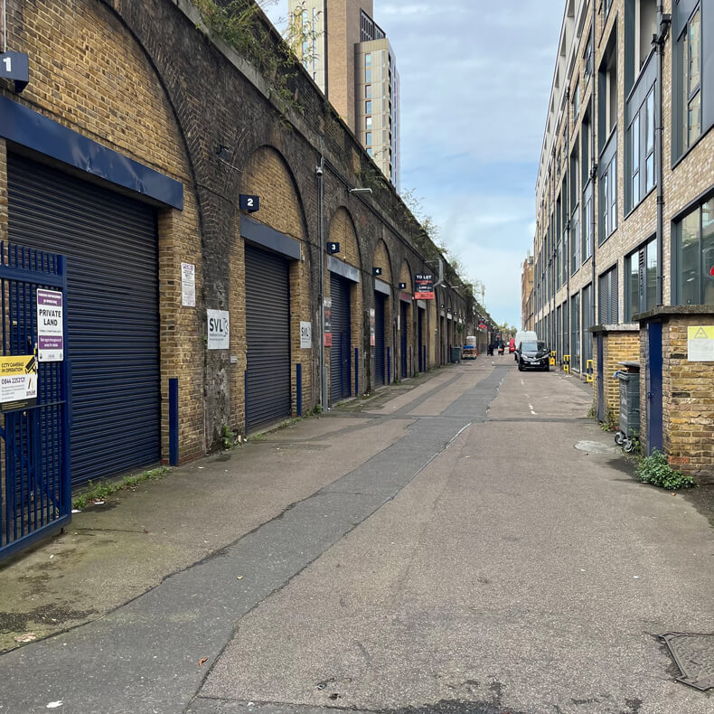 The lock-up Bond uses to store his Aston martin DB5 in from Skyfall. Filmed in Deptford, London (Visited October 2024)