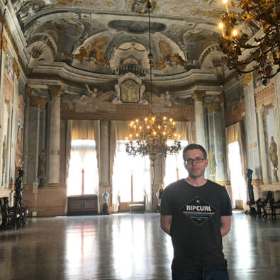 The ballroom of the Ca’Rezzonic in Venice as featured in Moonraker. This is the room that is used as Drax's office where Bond, M and Frederick Gray enter wearing gas masks. (Visited May 2018)