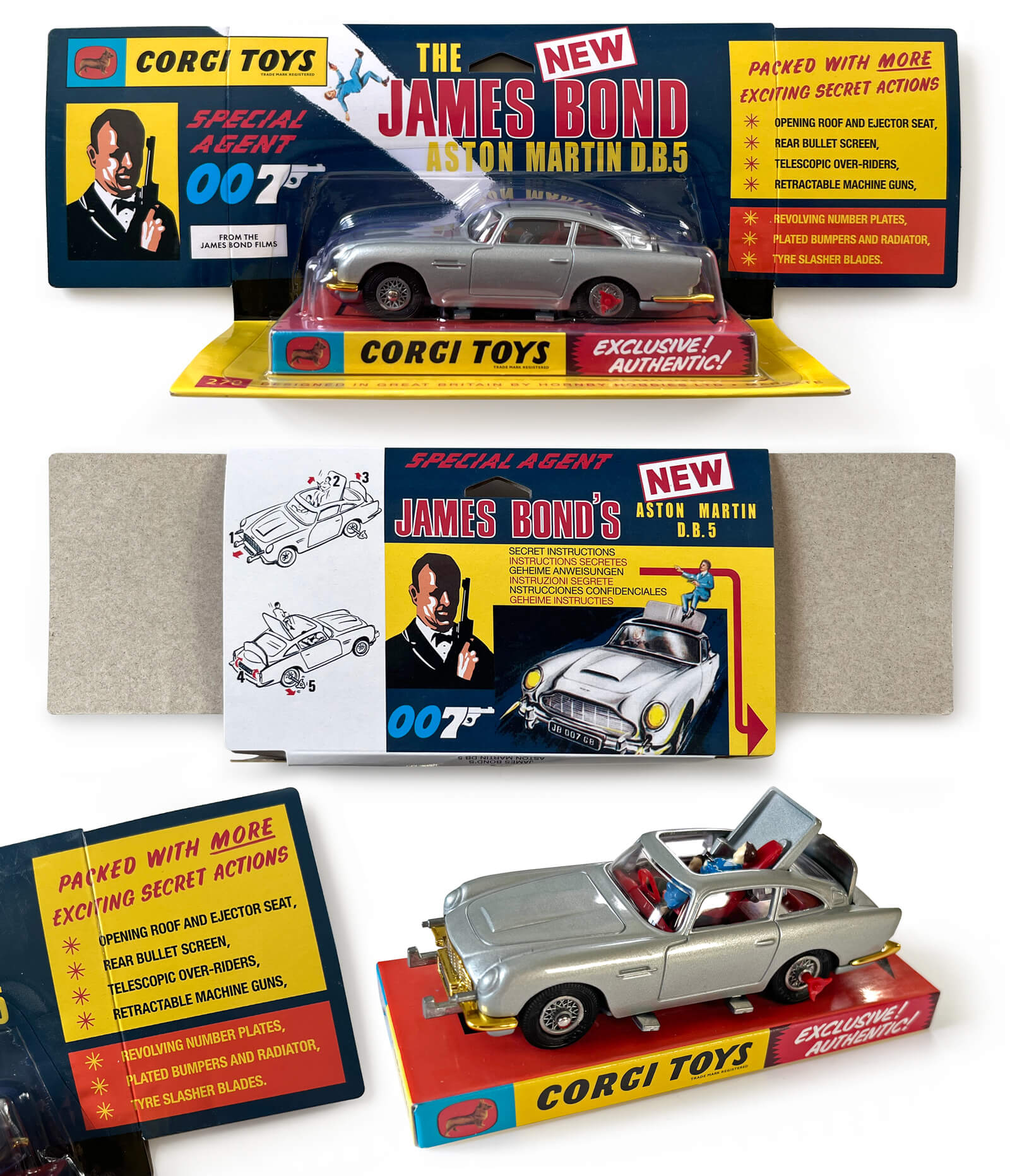 James Bond Aston Martin DB5 - model no. 271 with ejector seat, bulletproof screen, front machine guns and extending over-riders (Corgi, UK, 1981)